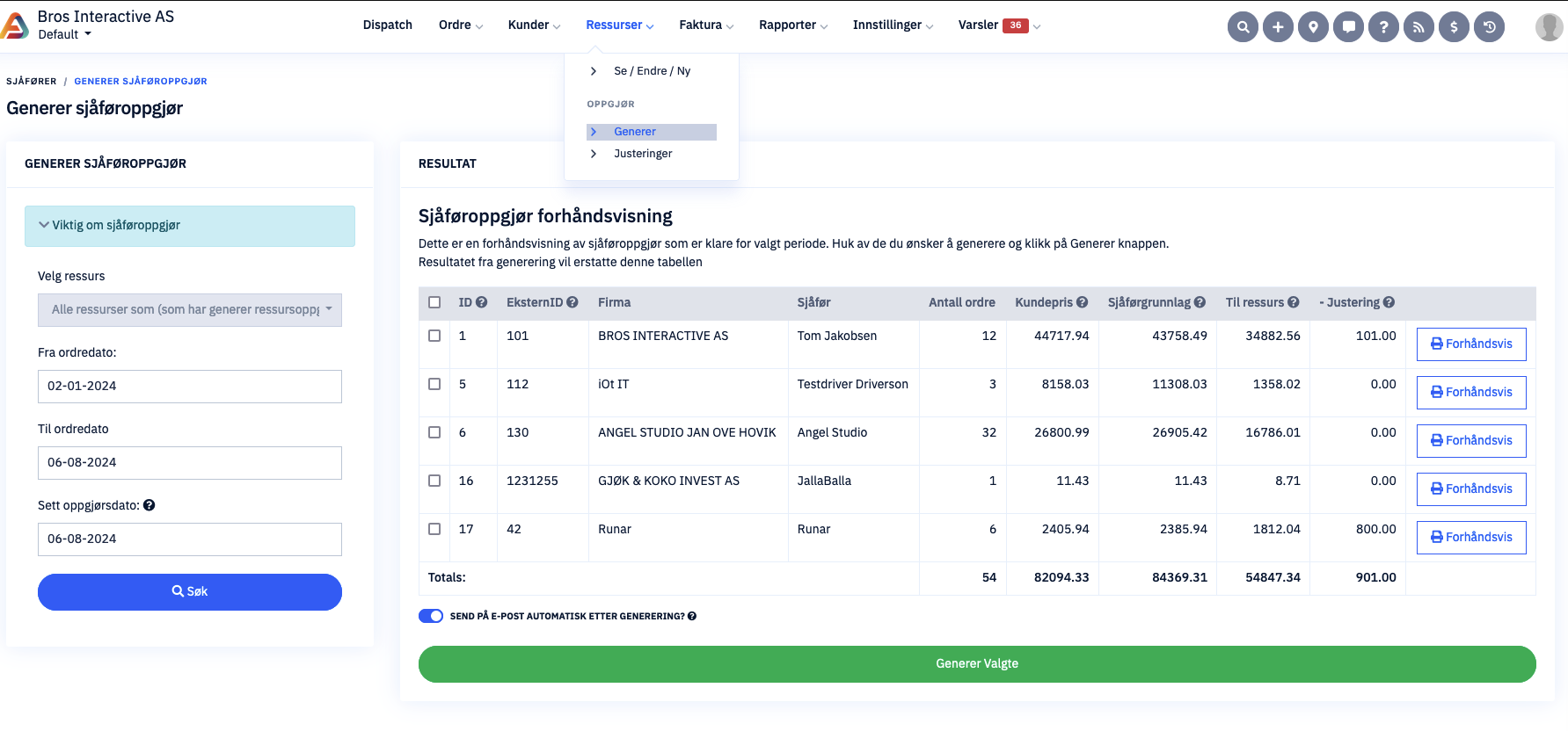 Her ser du hvordan det ser ut der du genererer sjåføroppgjør